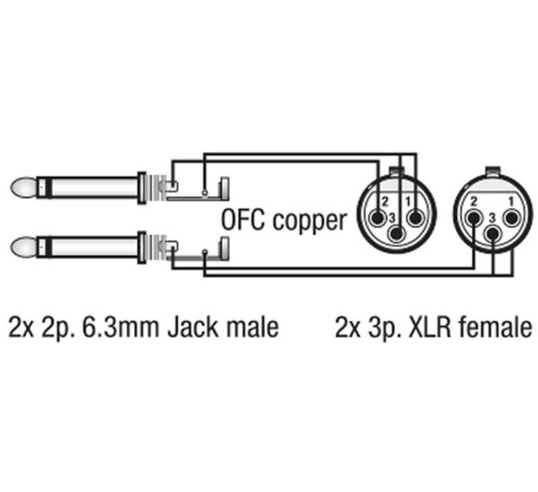 De kabel zet twee XLR female aansluitingen om naar twee 6,3 mm jack pluggen en is geschikt voor diverse toepassingen in studio’s, live-opstellingen en thuisgebruik.