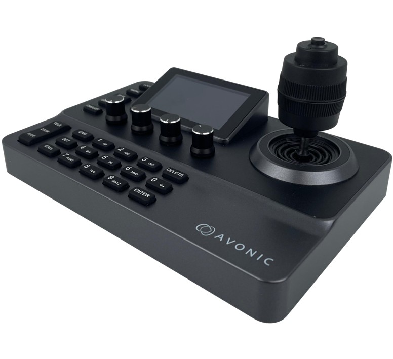 De Avonic CON200-IP is een compacte PTZ-cameracontroller met een 4D-joystick, een 3-inch Lcd-scherm voor preview en PoE.