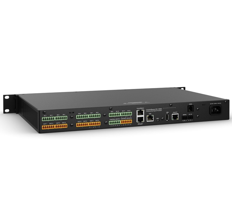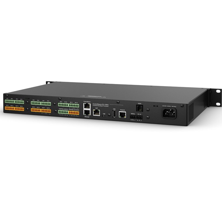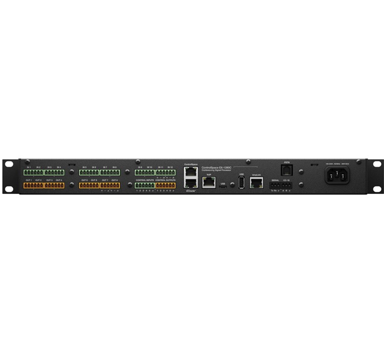 De ControlSpace EX-1280C-vergaderprocessor omvat 12 mic/lijn analoge ingangen, 8 analoge uitgangen, 8 AmpLink digitale uitgangen, 12 akoestische echo-onderdrukkers (AEC), 64 x 64 Dante voor een grote verscheidenheid aan audioconferentietoepassingen met geïntegreerde microfoon.