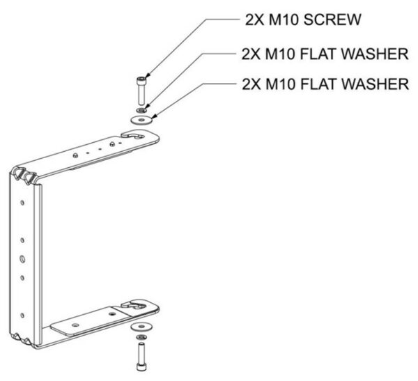 De beugel past op de M10 x 20 mm inzetstukken met schroefdraad aan de zijkant van de AMM108-luidspreker, wordt geleverd met de vereiste bevestigingsmiddelen om de U-beugel aan de luidspreker te bevestigen en is niet bedoeld voor permanente installatie buitenshuis.