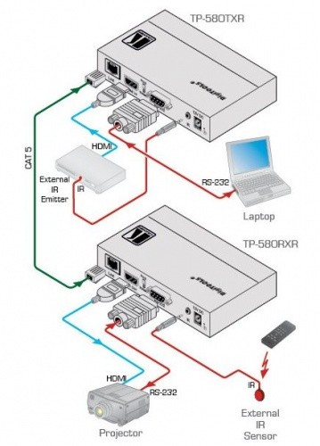The TP-580RXR receives an HDBaseT twisted pair signal from the TP-580TXR and converts it back into HDMI, RS−232 and IR signals.