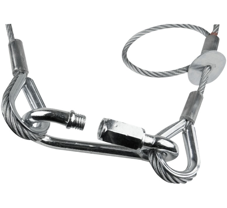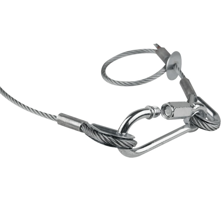 In geval van een defecte bevestiging voorkomt de kabel dat apparatuur naar beneden valt, wat zorgt voor maximale veiligheid voor zowel mensen als materiaal.